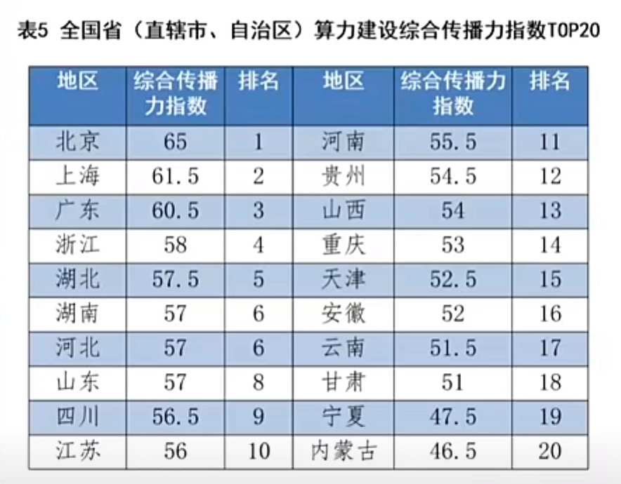 在算力建设综合传播力指数上看,北京、上海、广东、浙江、湖北的算力建设对外传播能力,处于全国领先地位。山东排名第八,综合传播力指数57。