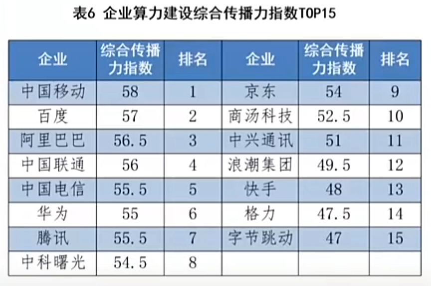 在企业算力综合传播力指数方面,上榜企业主要分为三大类:一是电信运营商,二是互联网头部企业,三是高新制造业企业。榜单显示,中国移动、百度、阿里巴巴、中国联通、中国电信的综合传播能力处于第一梯队。