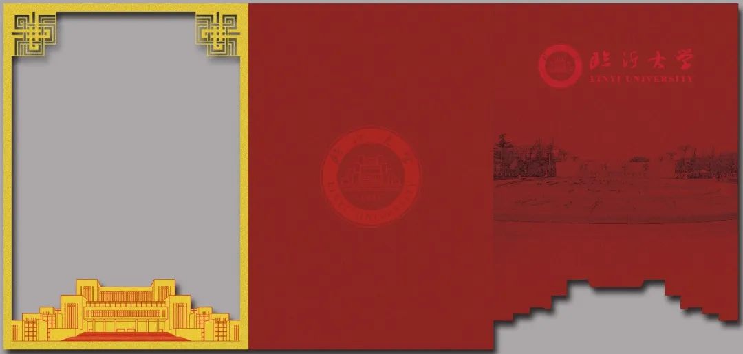 通知书内页采用镂空三折页的设计手法,将学校标志性建筑作为设计元素融入其中,从信封中取出内页时,通知书呈折叠状态,正面的暗纹图案为临沂大学校门,象征着临沂大学的包容并蓄。
