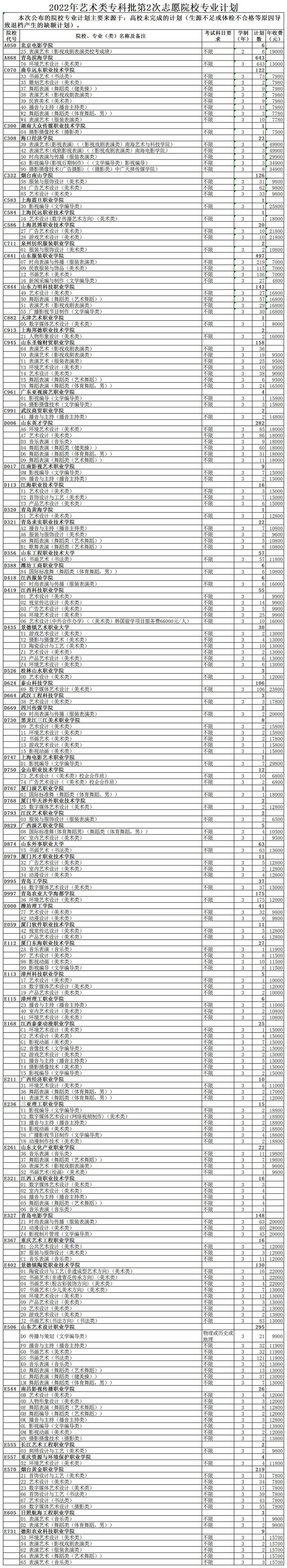2022年艺术类专科批第2次志愿院校专业计划
