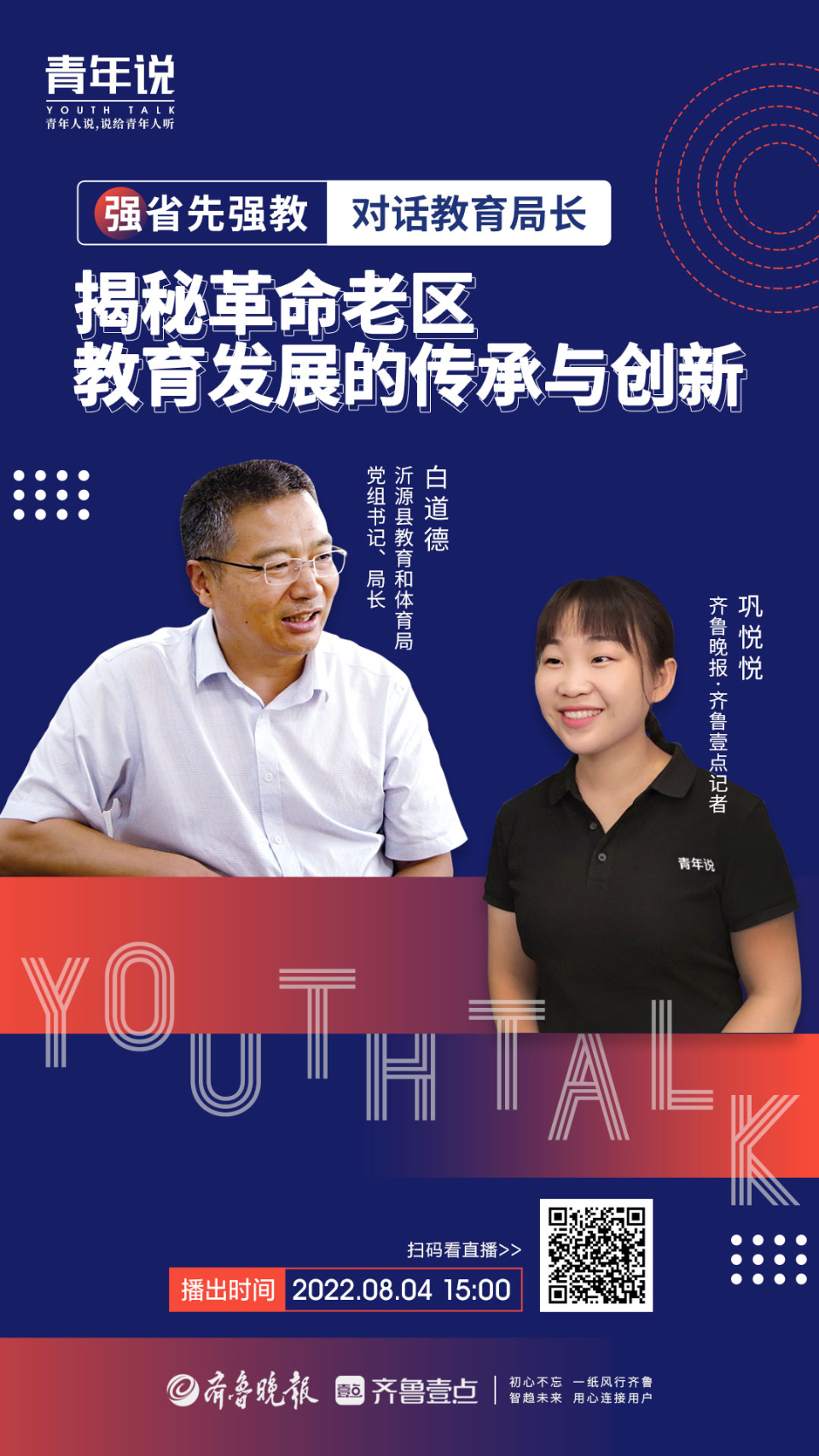 围绕群众关注的教育热点,齐鲁晚报·齐鲁壹点《青年说》栏目组专访了沂源县教育和体育局党组书记、局长白道德,讲述革命老区教育发展的传承与创新。