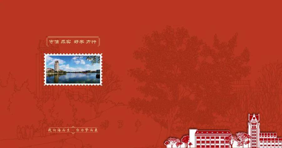 文件夹扉页自上而下依次是烟台大学校训、标志性景观和形象宣传用语。校训:“守信 求实 好学 力行”,激励着烟大人艰苦创业、奋发图强、勇于创新,取得了令人瞩目的发展成就。中间是烟台大学标志性景观钟楼和三元湖风景。烟台大学形象宣传用语——“我向海而生,你为梦而来”,寓意海纳百川、敢为人先的烟台大学张开双臂热情拥抱怀揣梦想而来的八方学子。