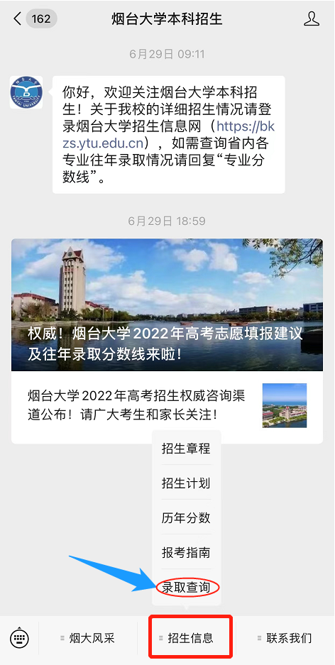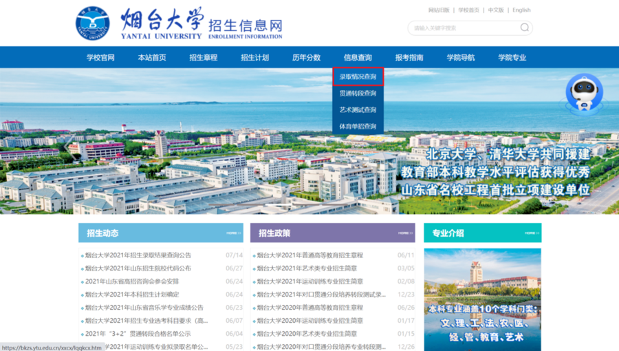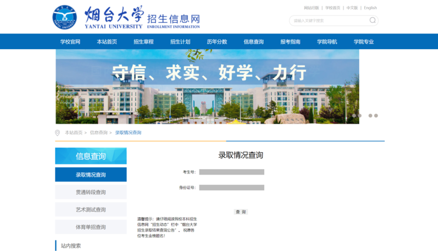 1.登录烟台大学招生信息网,导航栏“信息查询”,点击“录取情况查询”,输入个人信息进行查询。如身份证尾号为X,请使用大写的X;
