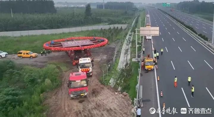 经交警和高速严格确认安全后,驶入高速,然后由山东交警护送,一路驶往潍坊。出高速时,采用通用的办法从护栏侧向驶出,并不需要拆掉收费口。