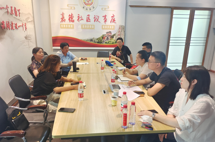 泰山区嘉德社区工作人员、嘉德现代城业主代表、物业企业代表开起议事会,共商小区智慧社区建设。