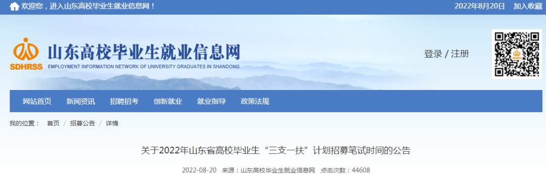 2022年山东省高校毕业生“三支一扶”计划招募笔试时间定于2022年8月28日9:00—11:30,准考证打印时间为8月24日9:00—8月28日9:30。