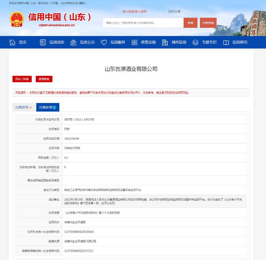 信用中国(山东)网站公布的行政处罚决定书文号:淄环罚字[2022]10019号显示,山东鲁源酒业有限公司放工业废气的排污单位未按照规定和检测规范设置采样检测平台,依据《山东省大气污染防治条例》第十五条第一款规定,淄博市生态环境局于2022年5月19日对其罚款6.5万元。