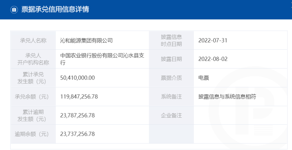 票据信息披露平台显示,沁和能源集团有限公司累计承兑发生额50,410,000元,承兑余额119,847,256.78元,累计逾期发生额23,787,256.78元,逾期余额23,737,256.78,承兑人开户机构名称为中国农业银行股份有限公司沁水县支行。