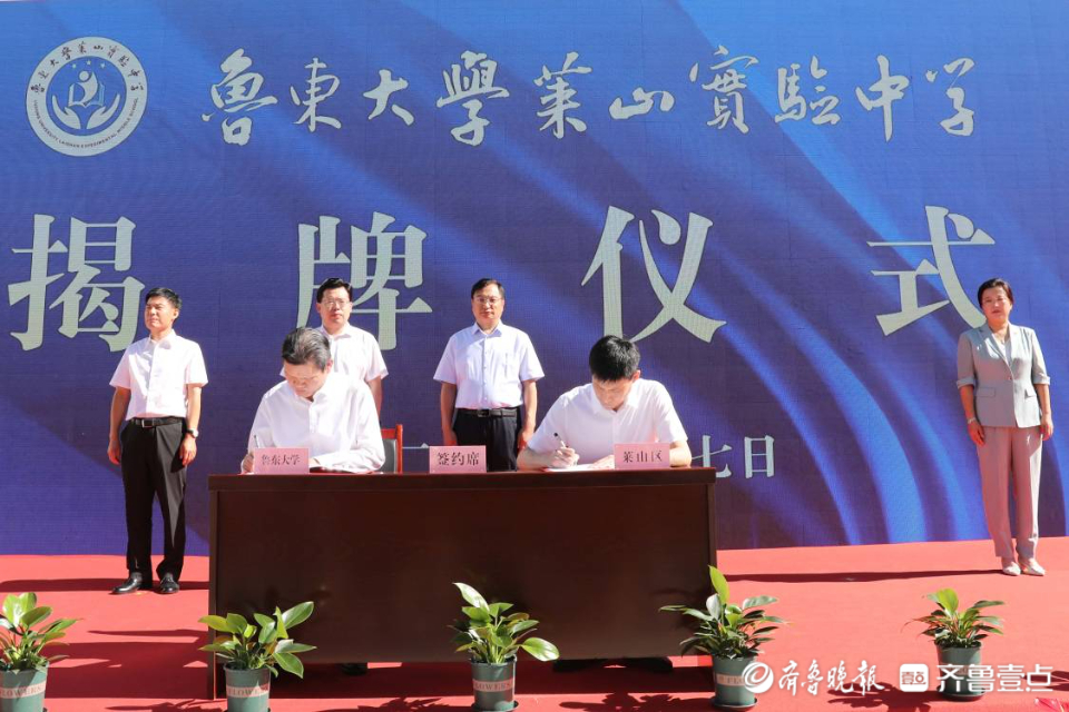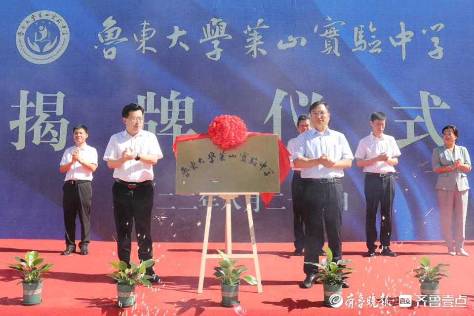 8月27日上午,鲁东大学莱山实验中学举行揭牌仪式。鲁东大学校长李合亮与莱山区委副书记、区长蒋海华共同为学校揭牌。