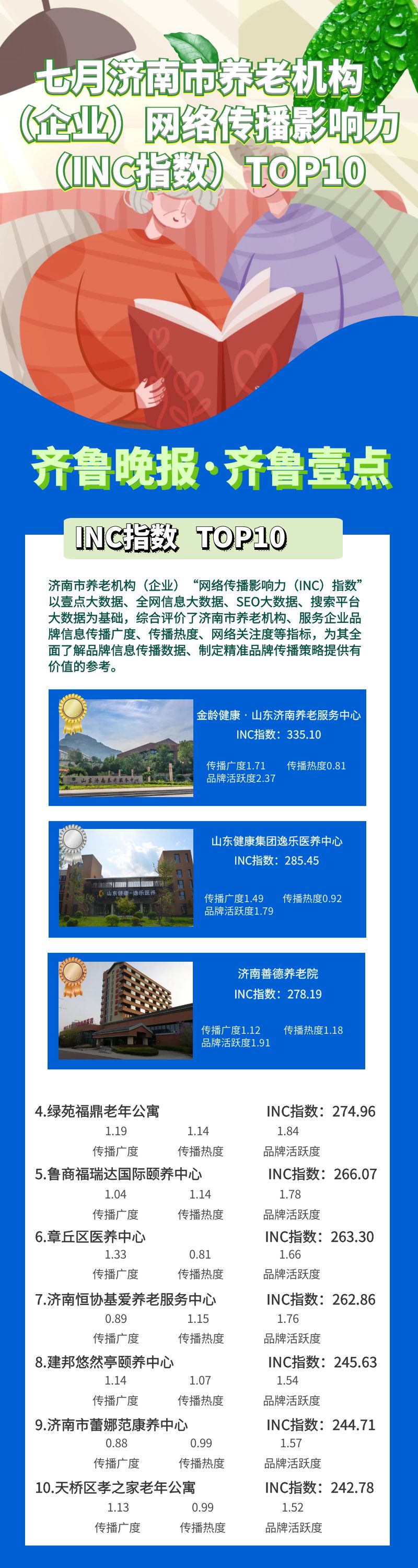 近日,齐鲁晚报壹点智库发布7月份济南市50余家入选养老机构(企业)的网络传播影响力指数(简称“INC指数”),其中,INC指数居前五位的分别是:金龄健康·山东济南养老服务中心(335.10)、山东健康集团逸乐医养中心(285.45)、济南善德养老院(278.19)、绿苑福鼎老年公寓(274.96)、鲁商福瑞达国际颐养中心(266.07)。