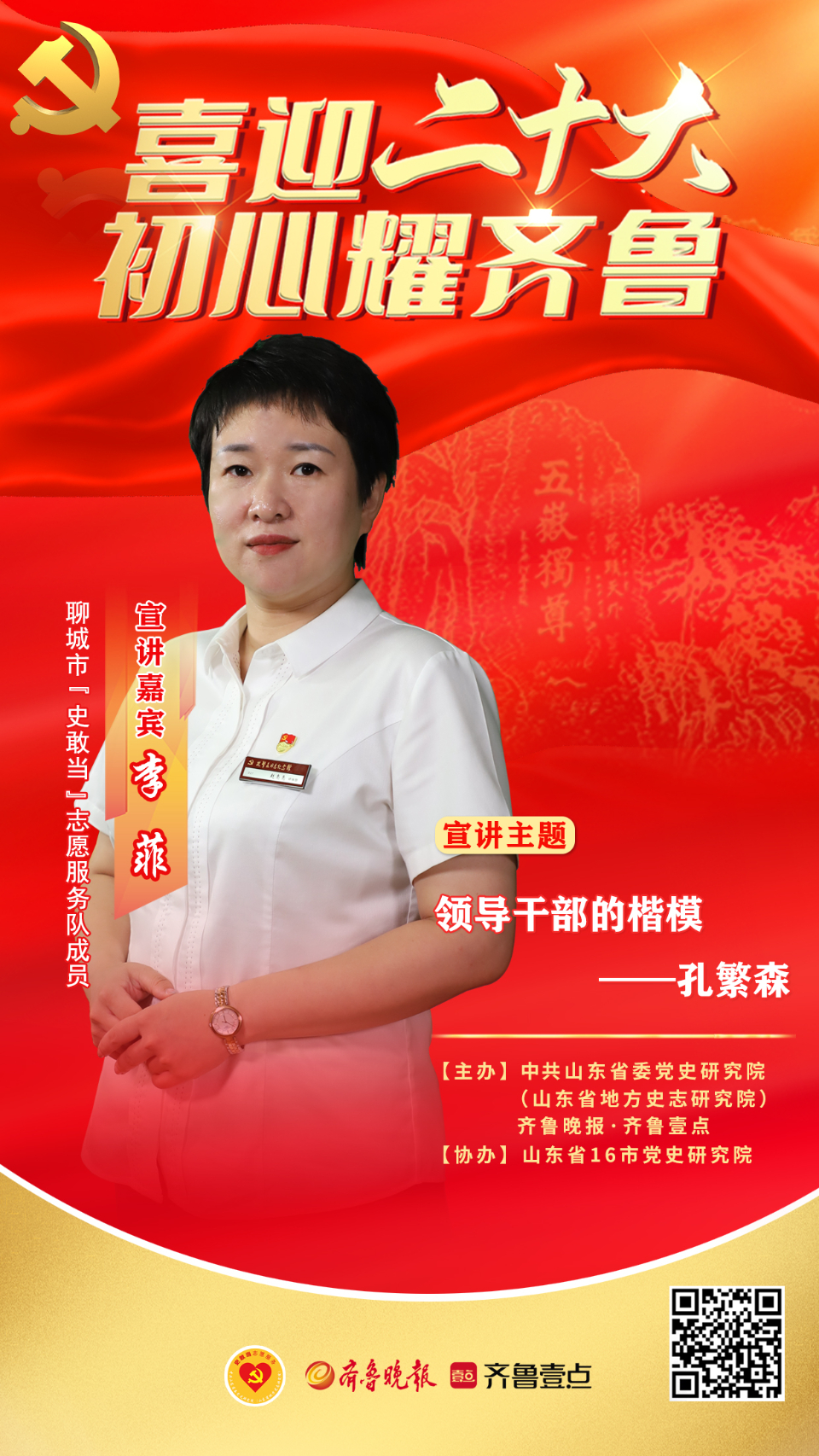 海报| 李菲:领导干部的楷模——孔繁森 齐鲁党建云 2022-10-08 1769 喜迎二十大·初心耀齐鲁!中共山东省委党史研究院(山东省地方史志研究院)与齐鲁晚报·齐鲁壹点联合主办,山东16市党史研究院协办,共同推出“喜迎二十大·初心耀齐鲁——山东省党史史志系统党史宣讲大型融媒策划”。本期宣讲嘉宾为山东省聊城市“史敢当”志愿服务队成员李菲,宣讲主题为《 领导干部的楷模——孔繁森》。 责任编辑:李和晴