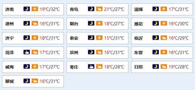 最低气温:鲁南和沿海地区17℃左右,其他地区15℃左右。