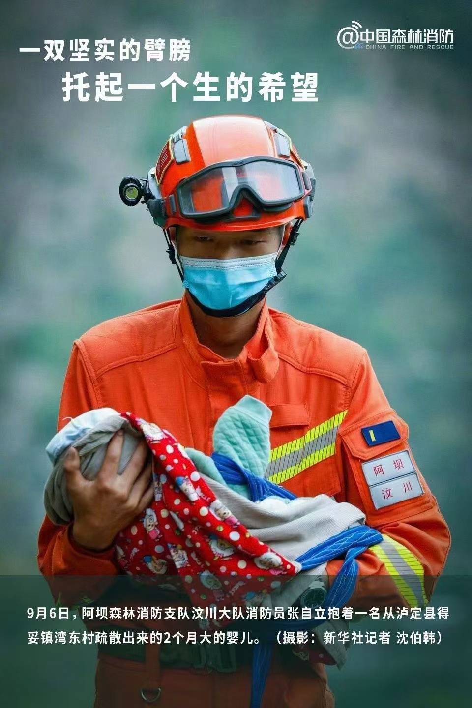 9月6日,四川森林消防总队阿坝支队汶川大队队员张自立抱着一名从泸定县得妥镇湾东村疏散出来的两个月大的婴儿,他臂膀上的“汶川”二字感动全网 。