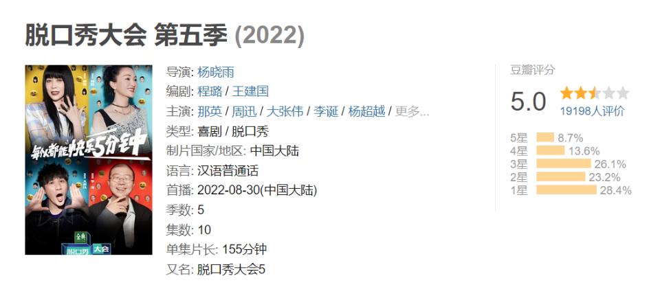 《脱口秀大会5》自8月30日开播以来,就争议不断。节目在豆瓣上评分的最低值仅有4.9分,如今略微回升,也刚刚达到5分而已,和前几季7.6分、7.9分的高分相比,已经是断崖式下跌。