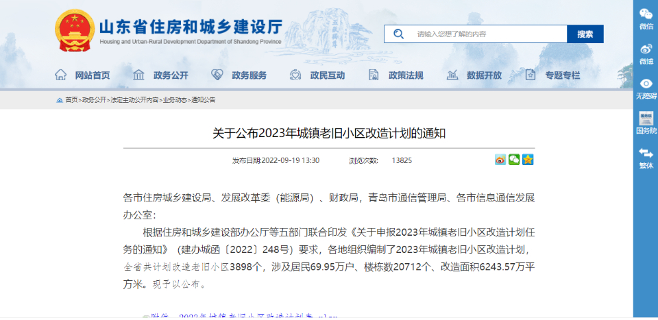 近日,山东省住房和城乡建设厅等五部门联合发布《关于公布2023年城镇老旧小区改造计划的通知》,2023年,山东全省共计划改造老旧小区3898个,涉及居民69.95万户。在计划改造小区涉及的居民数量上,2023年比2022年多了2.82万户。