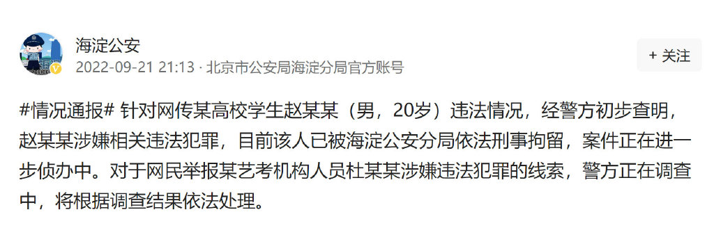 针对网传某高校学生赵某某(男,20岁)违法情况,经警方初步查明,赵某某涉嫌相关违法犯罪,目前该人已被海淀公安分局依法刑事拘留,案件正在进一步侦办中。对于网民举报某艺考机构人员杜某某涉嫌违法犯罪的线索,警方正在调查中,将根据调查结果依法处理。