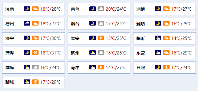 最高气温:聊城和菏泽29℃左右,鲁中山区和半岛地区23℃左右,其他地区26℃左右。