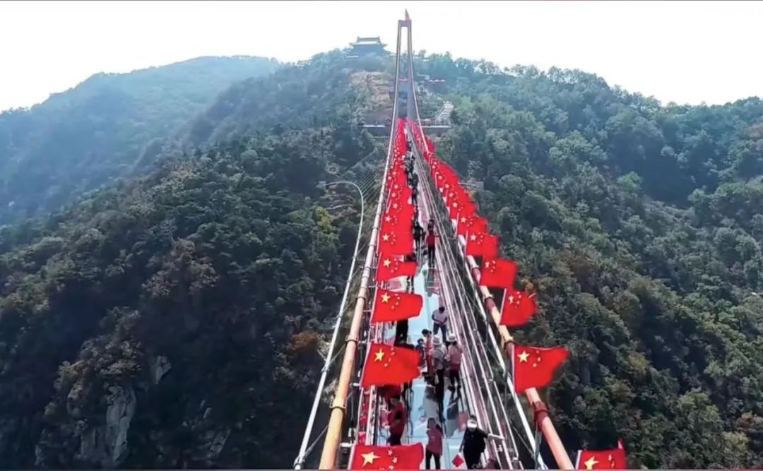 在费县蒙山天蒙旅游区,千面国旗被高高挂起,庄重而又喜庆。天蒙山人行悬索桥上,五星红旗迎风招展,像一条飘动的红丝带绵延不尽,在蓝天白云的衬托下,显得格外灿烂。