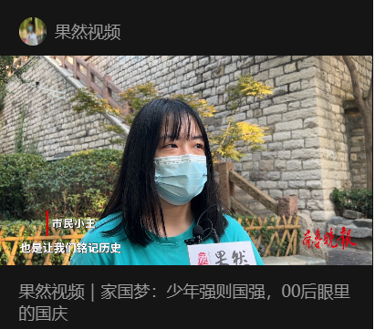 《果然视频|家国梦:少年强则国强,00后眼里的国庆》通过街采00后眼中的国庆节,折射出祖国发展为市民带来的幸福感与获得感,也传递出新青年对祖国未来的美好祝愿。