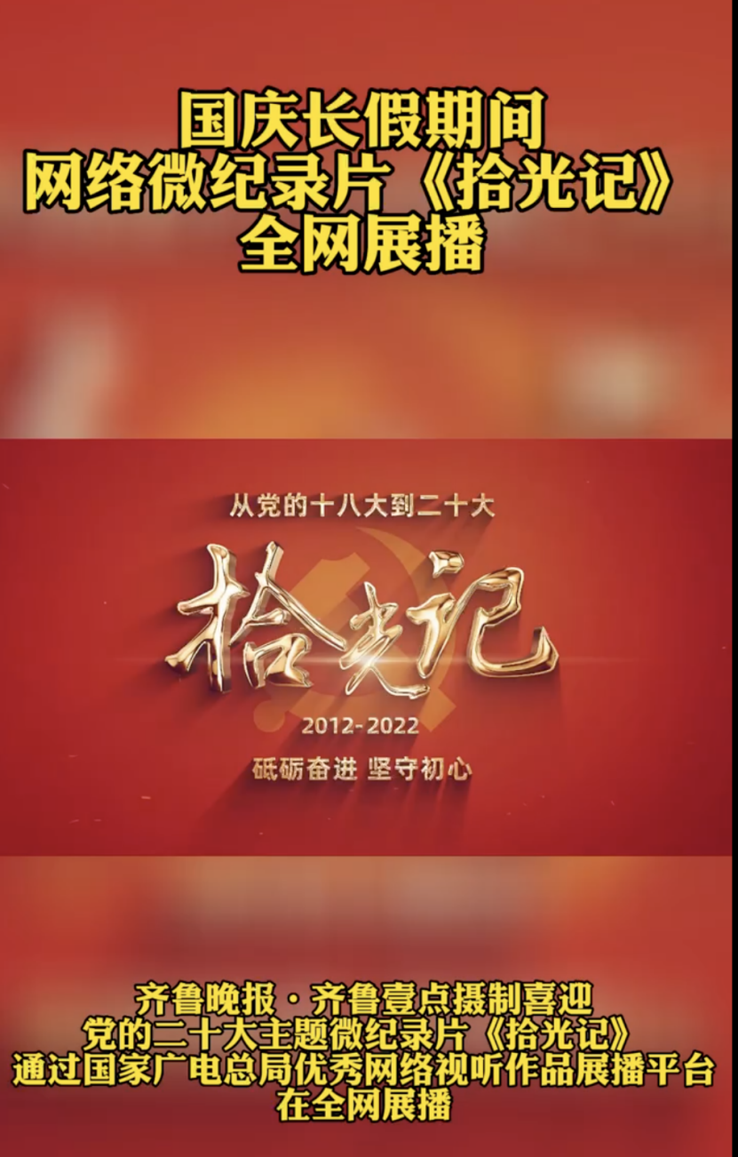值得注意的是,国庆长假期间,齐鲁晚报·齐鲁壹点摄制的喜迎党的二十大主题微纪录片《拾光记》,通过国家广电总局优秀网络视听作品展播平台在全网展播。