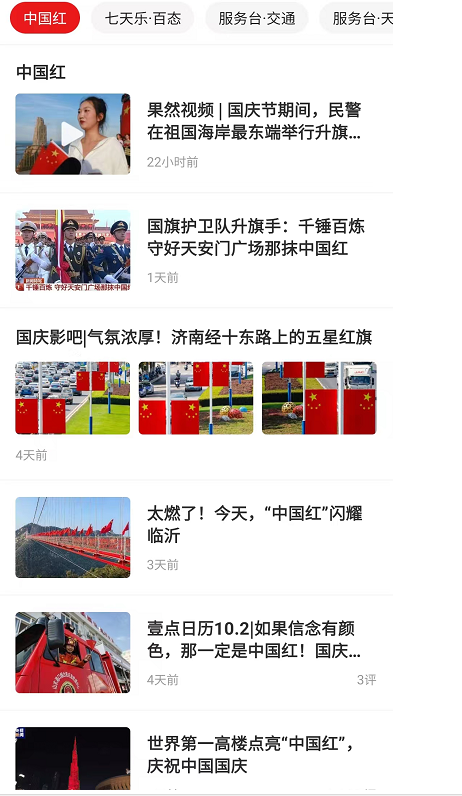 其中,《气氛浓厚!济南经十东路上的五星红旗》,通过拍摄济南经十东路街道两旁的五星红旗,为国庆节营造喜庆气氛;《太燃了!今天,“中国红”闪耀临沂》聚焦在费县蒙山天蒙旅游区,千面国旗被高高挂起,庄重而又喜庆,为祖国献上祝福;视频《国庆假期首日青岛栈桥人海了!五星红旗飘扬节日氛围浓》展现了市民在街头与五星红旗合影、共同庆祝的浓烈氛围。