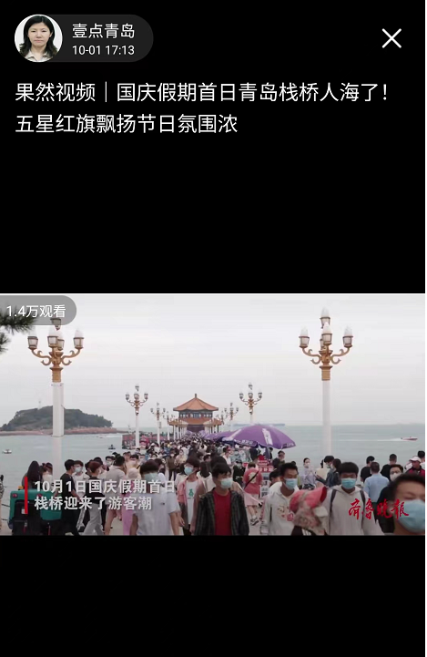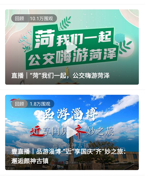 同时,各地市也推出了一系列特色直播。《“荷”我们一起,公交嗨游菏泽》:10月3日下午,记者坐公交带领用户沉浸式体验,嗨玩菏泽,该直播围观数量达10万;《十一假期,邀你登蓬莱仙阁品山海美景,听一场艺术盛宴》直播围观量11万。