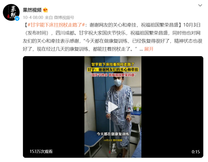 在短视频方面,果然视频发布的系列报道也引发了集体刷屏。在重阳节,果然视频发布了《七天乐:“银发族”重返职场,再就业成退休生活新方式》视频新闻,聚焦老年人再就业问题,引发网友讨论;《七天乐:火爆!国庆长假成“最拥挤结婚季”》则聚焦假日婚庆市场。国庆期间,济南婚庆消费出现了井喷式增长,引发广大用户关注。此外,国庆期间果然视频微博发布的《甘宇能下床拄拐杖走路了》的视频,点击量达153万次。