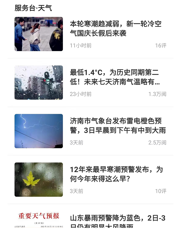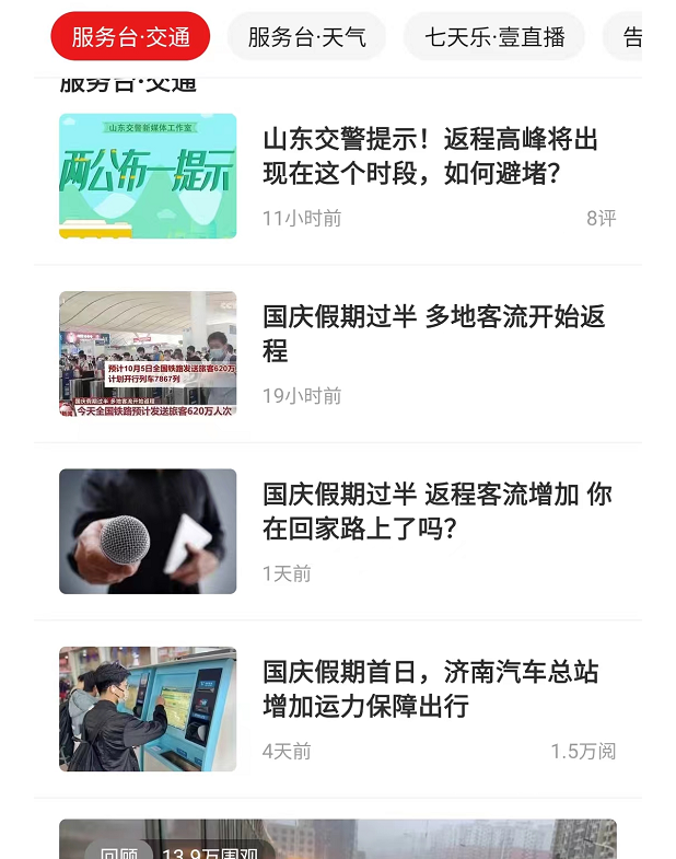 “十一”期间,齐鲁晚报·齐鲁壹点持续为用户提供及时、准确、全方位的天气、交通资讯。国庆假期,山东持续降温,寒潮预警发布,齐鲁晚报·齐鲁壹点在第一时间将相关信息发布,并为用户送上贴心防御指南,相关报道点击量达80万。此外,齐鲁晚报·齐鲁壹点全程报道各地交通管控情况以及交通拥堵路段和车流量的相关信息,为用户的假期出行保驾护航。