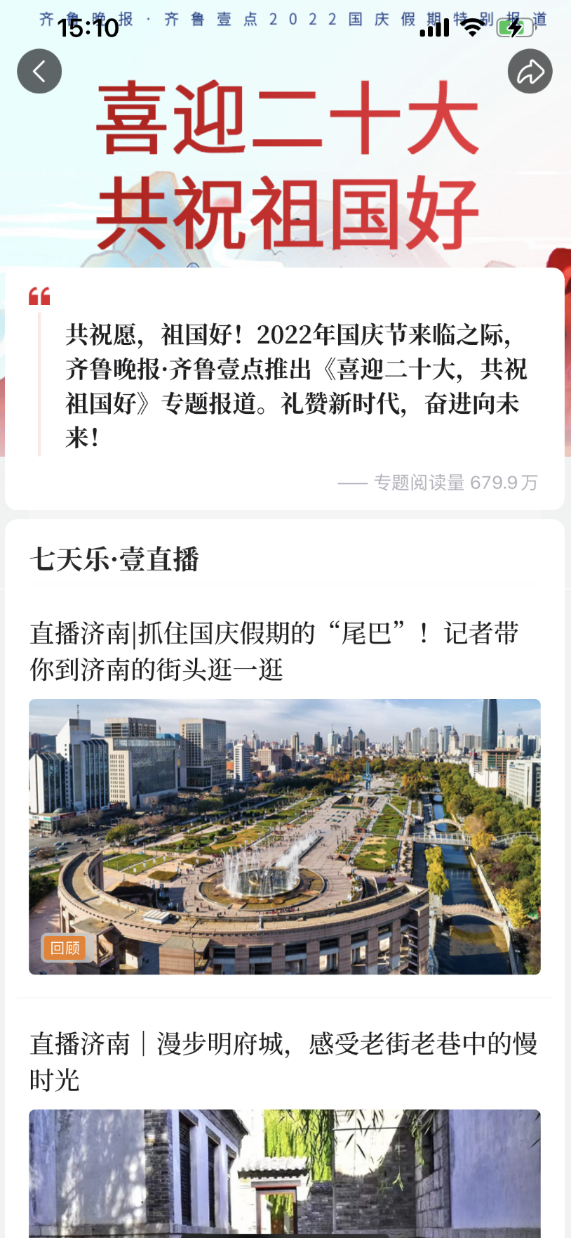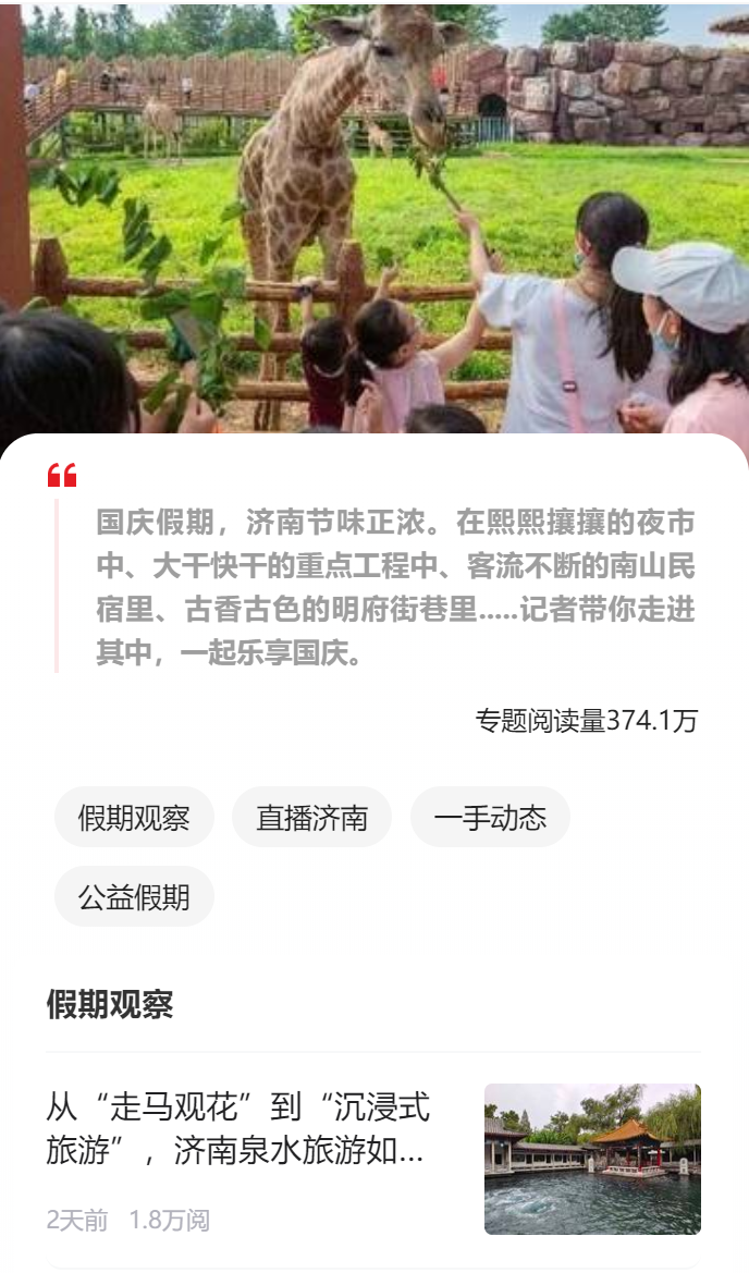 国庆节期间,齐鲁晚报·齐鲁壹点推出《七天乐》栏目,以直播、短视频等形式和用户云览大美齐鲁,聚焦各地百态,累计阅读量达100万+,其中同城热搜话题7个,包括#济南泉水水位撒欢儿往上蹿#、#济南九如山开启浪漫赏秋季#等,话题累计阅读600万。