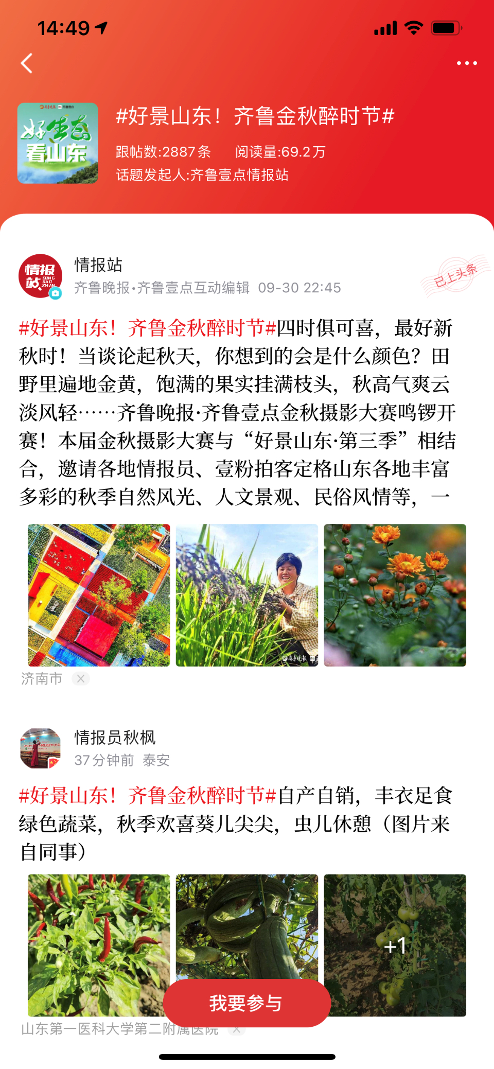 除此之外,还有“好景山东·齐鲁金秋醉时节”——第三届金秋摄影大赛,#国庆假期近郊游,宝藏路线大PK#,累计收到来自全省各地的2300余幅摄影作品,各地情报员和摄影拍客一起来晒出秋天里的山东美。