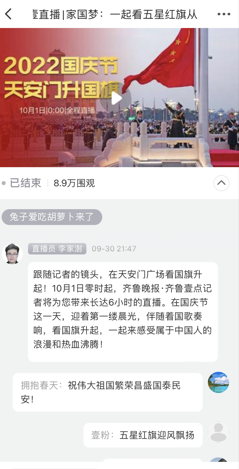 10月1日,齐鲁晚报·齐鲁壹点从零时起开始长达6个小时的直播,在国庆节这一天迎着第一缕晨光,伴随着国歌奏响,和万千用户一起看国旗升起,一起来感受属于中国人的浪漫和热血沸腾。