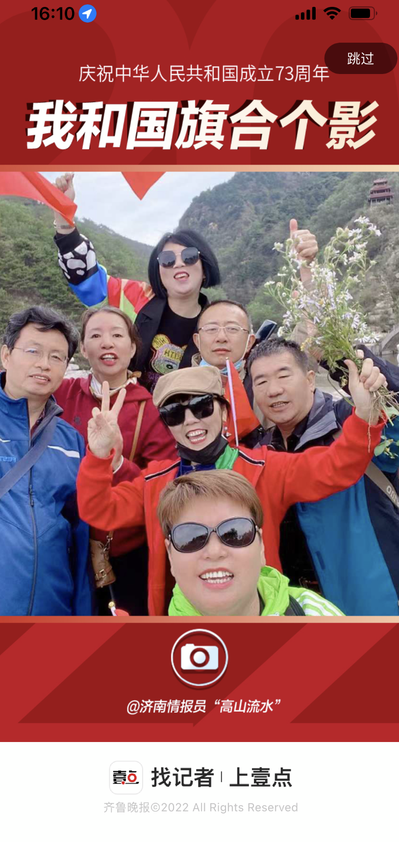 齐鲁晚报·齐鲁壹点已连续多年在国庆假期组织“我和国旗合个影 壹点送您上开屏”用户互动策划。今年国庆节,山东各地数万名壹粉举起红旗、拿起相机,记录下美丽的中国红,展现出火热的中国心,众多壹粉与国旗合影登上壹点开屏!