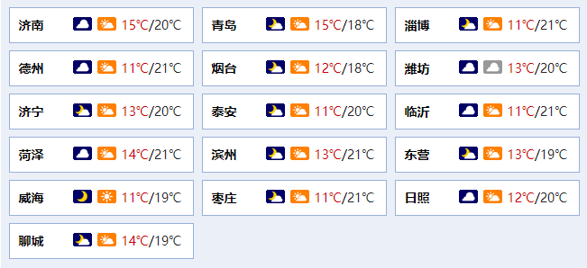 最低气温:临沂、日照、鲁中山区和半岛地区11℃左右,其他地区13℃左右。
