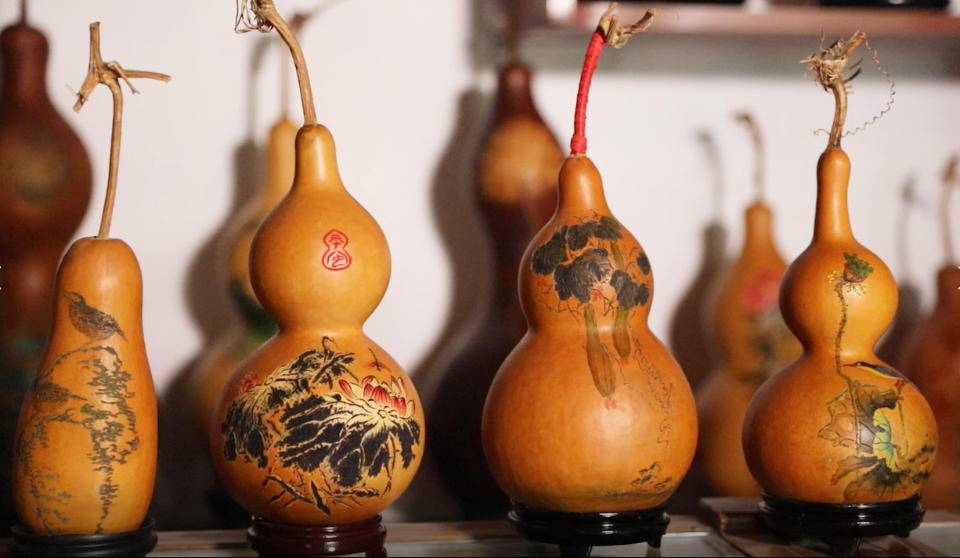 这门技艺集烙画、雕刻、轧花、模具、彩绘、镂空等多个制作工艺为一体,在传统基础上,马友谊改造发明了针刀并用、彩刻、雕烙刻三结合等技法。马友谊告诉记者,葫芦雕刻的材质以章丘本地葫芦为主。“根据我们要创作的作品,来提前选择葫芦的器形,比如亚腰、扁圆、长柄葫芦等品类,不同的葫芦形态最终的呈现效果也不一样。”