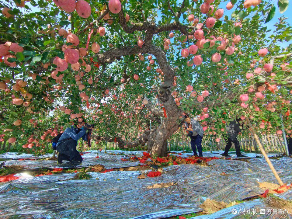 参加融媒行的记者们走近138岁的老果树。齐鲁晚报·齐鲁壹点记者 赵金阳 摄