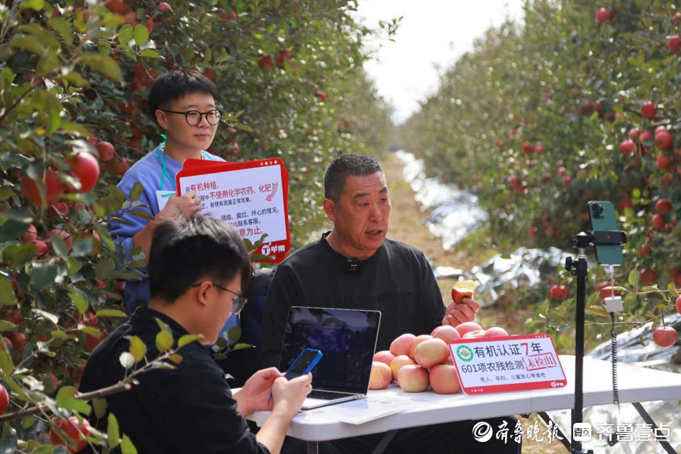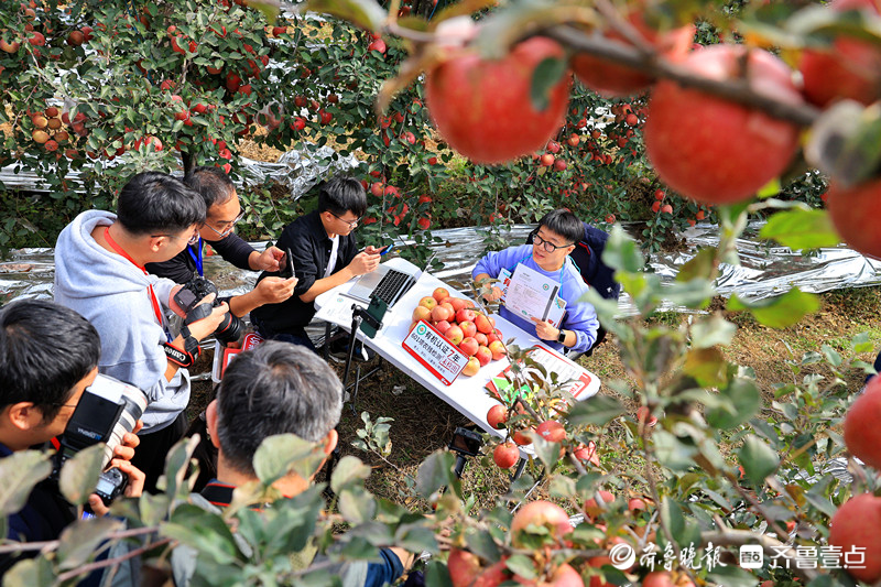 牟平区高陵生态果蔬产业有限公司的工作人员在果园里直播卖苹果。齐鲁晚报·齐鲁壹点记者 王鑫 摄