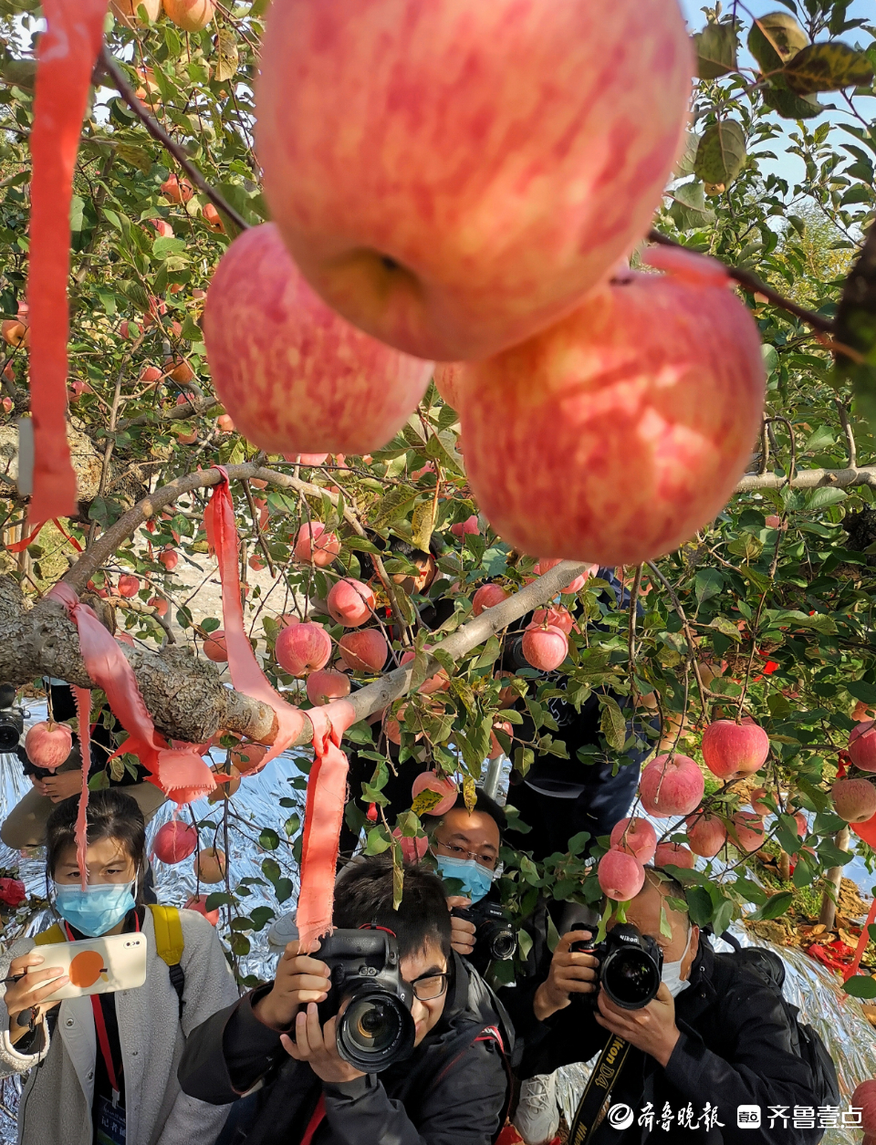 在烟台沃森农业苹果园,媒体记者聚焦百年老果树。钱捍 摄