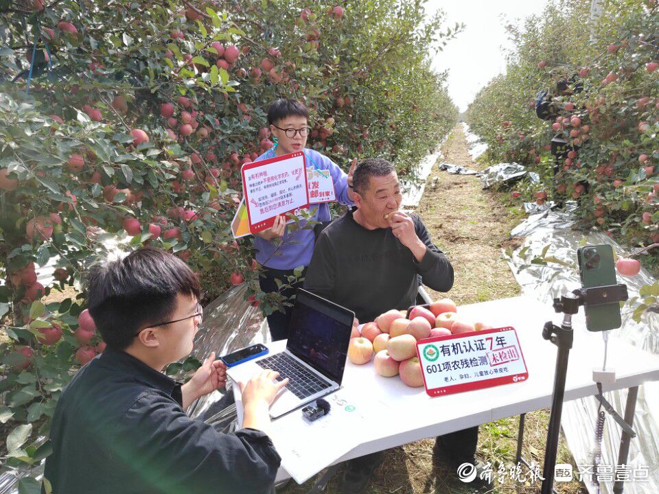 烟台市牟平区高陵生态果蔬产业有限公司的工作人员在果园里直播卖苹果。齐鲁晚报·齐鲁壹点记者 王鑫 摄