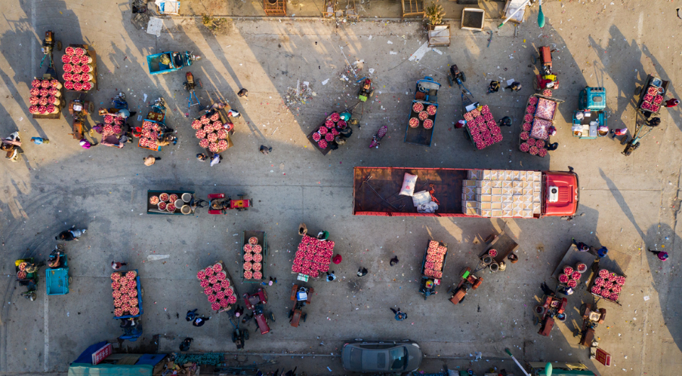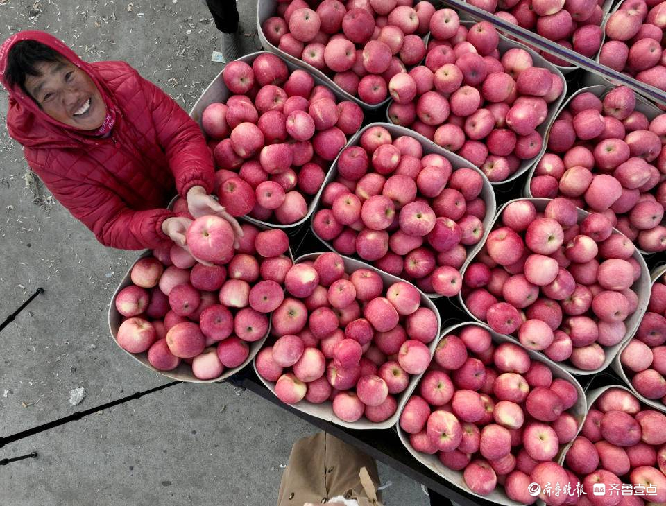 10月29日下午,烟台栖霞寺口镇苹果交易市场内,无人机镜头拍摄下了一张果农李福珍手捧苹果向上展示的照片。