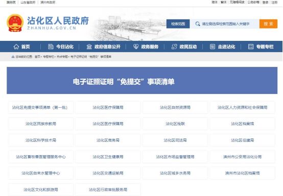 目前,已在沾化区人民政府官方网站设立“无证明城市”专栏(http://www.zhanhua.gov.cn/col/col283348/index.html),公示《沾化区电子证照证明“用证”事项清单(第一批)》共631项,包括身份证、营业执照、不动产证明、卫生许可证等证照证明48类。办事群众通过爱山东APP申领身份证、营业执照电子证照,实现“免证办”“零跑腿”,切实提升群众获得感和满意度。