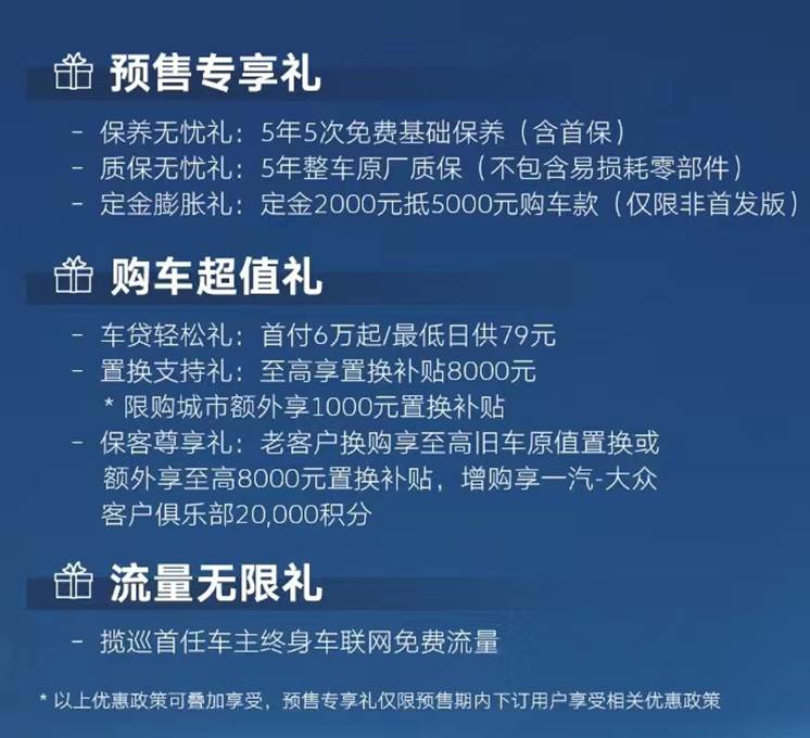 因此揽巡除了祭出极具竞争力的预售价格外,还通过极具吸引力的购买和服务政策,最大化的让用户获得真金白银的实惠。其中购车超值礼包含首付6万元起/最低日供79元的车贷优惠;至高8000元置换补贴,限购城市额外享1000元置换补贴;老客户换购至高旧车原值置换或额外享至高8000元置换补贴,老客户增购享一汽-大众客户俱乐部20000积分。流量无限礼包含揽巡首任车主终身免费流量。同时,现在开始参与预订的用户,还将享受5年5次免费基础保养(含首保)、5年整车原厂质保(不包含易损耗零部件)、定金2000元抵5000元购车款(仅限非首发版)的预售限时专属权益。多项福利可叠加享受,给足用户满满的诚意与惊喜。