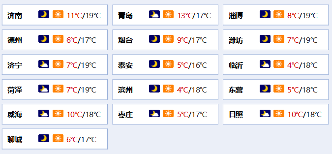 各位壹粉大家好, 今天是11月17日,星期四,农历十月二十四。全省天气多云间晴;鲁南地区17日早晨前后有雾或轻雾。南风,半岛地区4~5级,其他地区3~4级。 最低气温:鲁中山区4℃左右,沿海地区8℃左右,其他地区6℃左右。 最高气温:鲁中山区和沿海地区16℃左右,其他地区18℃左右。