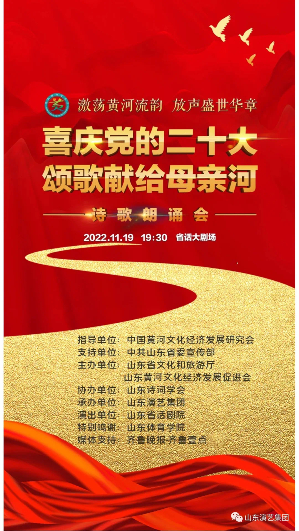欢迎您关注“喜庆党的二十大 颂歌献给母亲河”诗歌朗诵会。朗诵会还将通过“齐鲁壹点app”“齐鲁云剧场”网络直播。