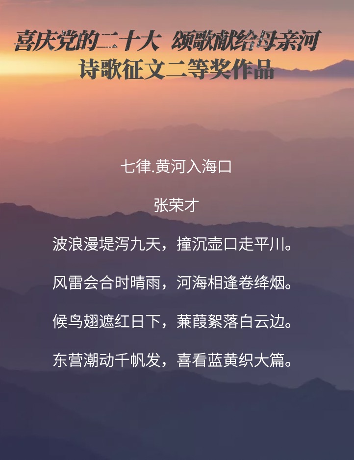 日前,在诗歌征文比赛中获得二等奖的张荣才先生接受了采访。作为新中国的同龄人,他是听着《黄河大合唱》长大的,“风在吼,马在叫,黄河在咆哮”每每听到热血沸腾。张荣才曾多次到黄河考察,在他眼中黄河入海口是“天在水中,水在天上,山水相映,如诗如画,比画优美,比诗浪漫。”