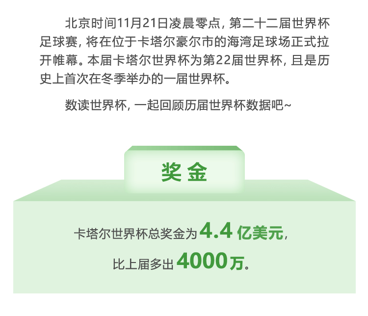 壹点数说|数读世界杯·历届世界杯你了解多少? 大众报业·齐鲁壹点 2022-11-19 1.2万 北京时间11月21日凌晨零点,第二十二届世界杯足球赛,将在位于卡塔尔豪尔市的海湾足球场正式拉开帷幕。本届卡塔尔世界杯为第22届世界杯,且是历史上首次在冬季举办的一届世界杯。 数读世界杯,一起回顾历届世界杯数据吧~ 数据来源:公开数据整理 责任编辑:赵夏晔