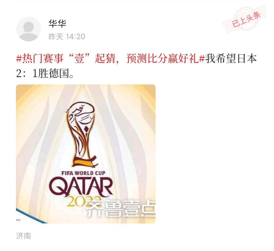 23日,齐鲁晚报·齐鲁壹点第三场竞猜互动关注日本VS德国的比赛。日本队2比1逆转击败德国队,本场比赛是德国队与日本队的首次正式交锋,也爆出了本届世界杯的第二个大冷门。
