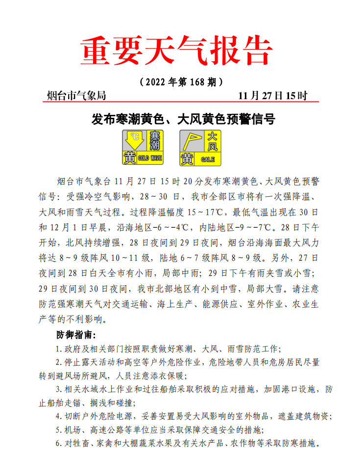 局部大雪!烟台市发布寒潮黄色、大风黄色预警信号
