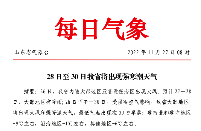 28 日,受强冷空气影响,山东气温持续下降,大部地区出现小雨天气。30 日起,全省各地气温将达到今年入冬以来最低,鲁西北及鲁中地区气温将达到-12~-10℃;沿海地区气温将到达-5~-3℃;其他地区气温将达到-8~-6℃。此次强寒潮过程降温幅度大、风力大、半岛北部地区降雪强,对交通运输、海上生产、能源供应、室外作业、农业生产及疫情防控等有不利影响。