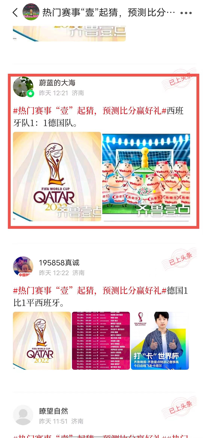 【参与方式】下载齐鲁晚报官方客户端――齐鲁壹点,在情报站点击话题#壹起世界杯,玩转冬日足球盛宴!好礼等你来#,写下你的竞彩比分+理由上传即可。
