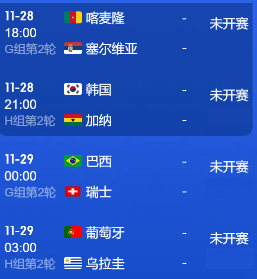 北京时间11月28日卡塔尔世界杯进入第八个比赛日,将进行G组、H组第二轮的小组赛较量,这也是世界杯小组赛第二轮的最后四场比赛。巴西队生死战对阵瑞士队、孙兴慜带领韩国队对阵“非洲雄狮”加纳队、C罗所在的葡萄牙队又会给我们带来什么惊喜呢?